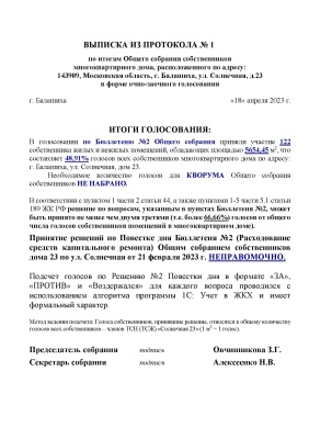 Выписка из Протокола Общего собрания собственников (Бюл.2, кап.ремонт) - апрель 2023 г.