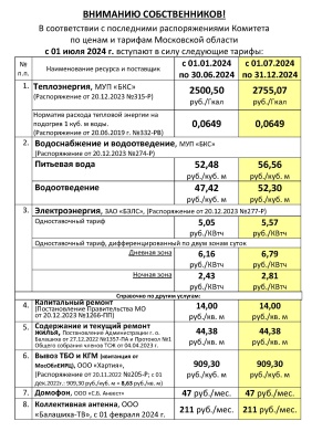 Тарифы для начисления коммунальных услуг с 01 июля 2024 г.